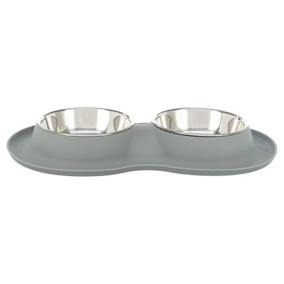 Comedero doble de Trixie que consta de dos cuencos para la comida y el agua, y está combinado con una base antideslizante de silicona. Esta garantiza que el comedero se mantenga en su sitio incluso en suelos lisos y, por tanto, no raye el suelo. Los dos cuencos son de acero inoxidable, por lo que son muy resistentes, higiénicos y fáciles de limpiar, además se pueden lavar en el lavavajillas.