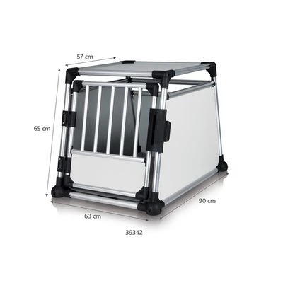 Jaula grande de transporte para perros; robusta y ligera, pues está fabricada con aluminio. Las puertas anterior y posterior oblicuas ahorran espacio en el maletero. Con alfombrilla térmica.