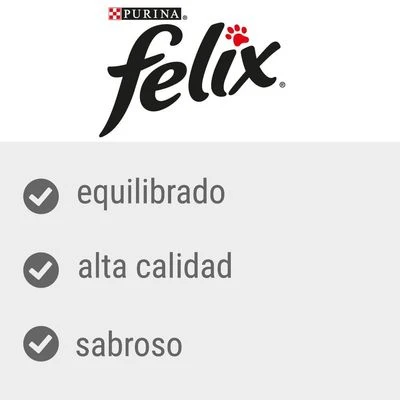 Felix Estándar comida húmeda para gatos contiene 120 sobres con deliciosas y variadas recetas en salsa o gelatina, recetas elaboradas con ingredientes de calidad y con un contenido elevado de humedad, para mantener a tu gato hidratado. Los sobres de comida húmeda de Felix contienen un porcentaje equilibrado de minerales, y están enriquecidos con ácidos grasos insaturados omega-6, para una piel sana y a un pelaje brillante. La comida húmeda de Felix está enriquecida con vitaminas D y E que aportan vitalidad a tu gato.