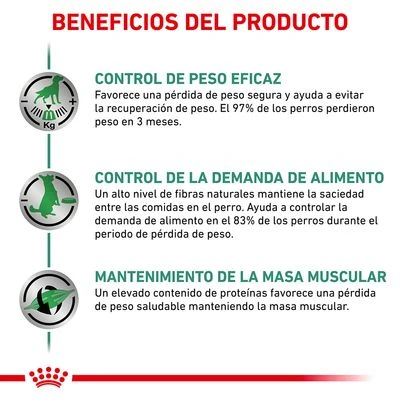 Royal Canin Veterinary Canine Satiety Weight Management es un alimento dietético completo para perros con sobrepeso. Es bajo en calorías y rico en proteínas y fibra natural, lo que mantiene la musculatura y proprciona una sensación agradable de saciedad.